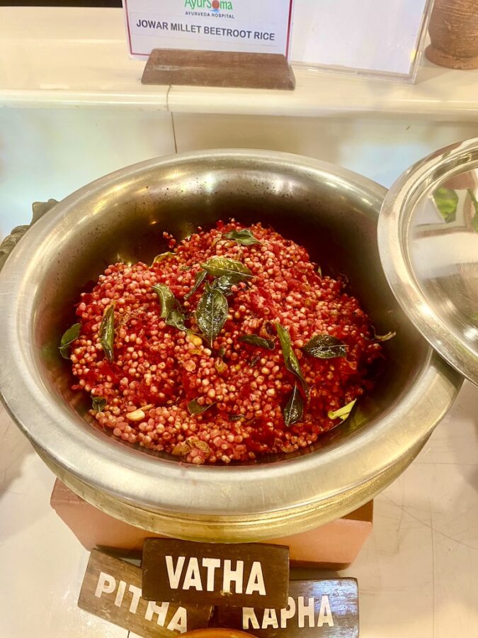 Andere favorieten zijn jowar millet beetroot rice: gierst met bietjesrijst. Veg methi: gemengde groenten van wortel, sperziebonen, erwten en aardappel. Thoran, met spinazie. Sambar: groenten in een smaakvolle milde saus. Aloo achari: aardappel met pickel. En verder eet ik graag gestoomde banaan, verse en gegrilde ananas en zoete papaya. Bij het ontbijt is er een lekker Ayursoma special breakfast: ananas, watermeloen, kokosrasp en kiemplantjes.